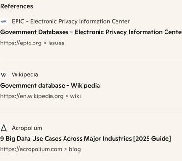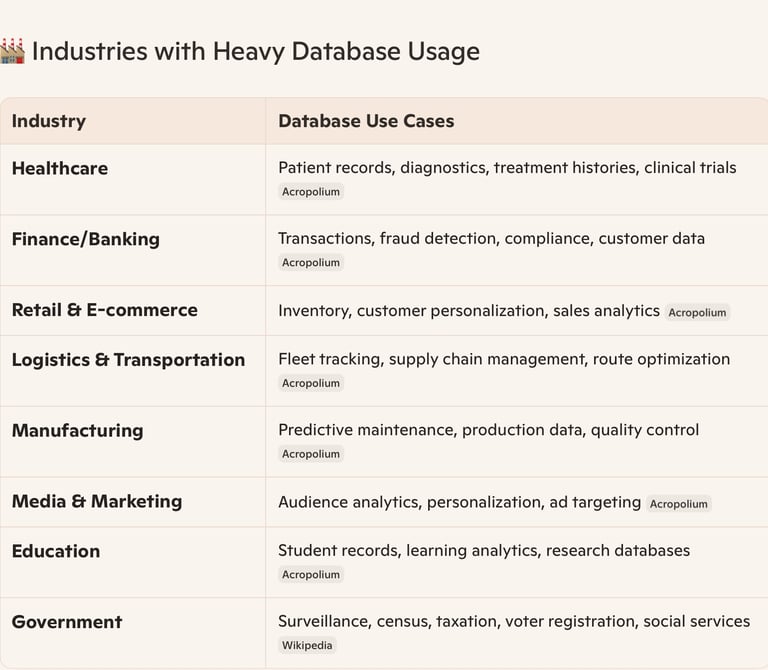 ✅ In short: Law enforcement, healthcare, finance, and retail are the biggest database users, while government agencies like DHS, IRS, and public health departments manage the most sensitive and expansive datasets.